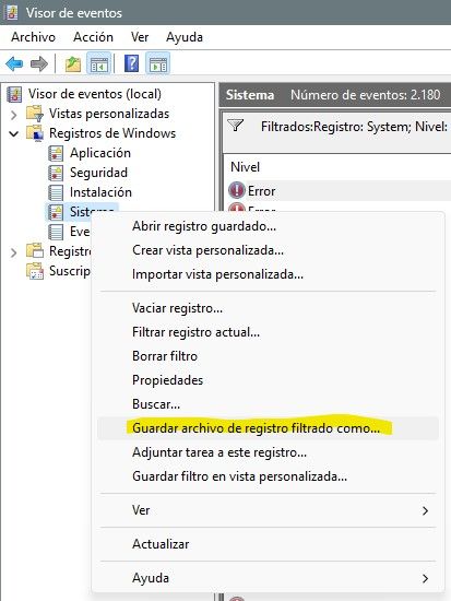 3. Now that the logs have been filtered and only show the important errors, right click over System section and select Save Filtered Log File As...